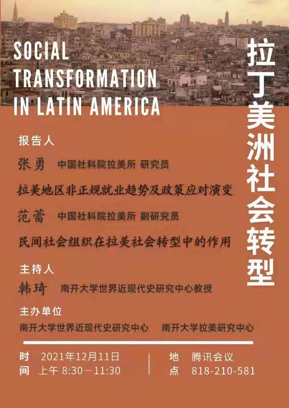 2021年12月11日,由南开大学世界近现代史研究中心和南开大学拉丁美洲研究中心举办的“拉丁美洲社会转型”报告会在线上举行,中国社科院拉美所的张勇研究员和范蕾副研究员应邀主讲,南开大学世界近现代史研究中心副主任韩琦教授主持会议,南开大学拉美中心主任董国辉教授、潘芳副教授以及中心的研究生共同参与了此次报告会。