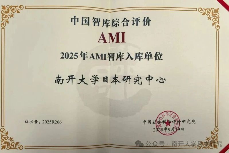 2025年10月初,中国社会科学院中国社会科学评价研究院公布了最新中国智库综合评价2025年(AMI)智库入库单位名单,南开大学日本研究中心入选。中国智库综合评价研究项目(AMI)是由中国社会科学评价研究院于2016年启动,具有权威性和影响力的全国性智库评价活动。